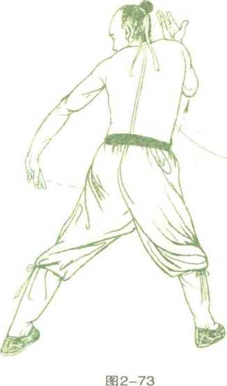 3.右脚尖外展,左脚向前侧进一 大步.重心左三右七.成右偏马步:同 时,右掌外旋上提并略向后收?置于 头部右侧,掌尖向上,掌心向后;左掌 内旋成俯掌,向体左侧砍出,高与胯 齐,与左脚约在同一平行线上,左臂 成弧形,目视左掌。(图2-73)