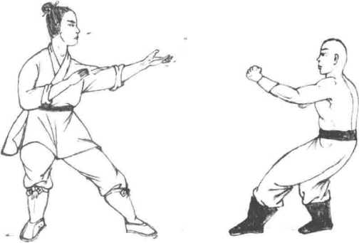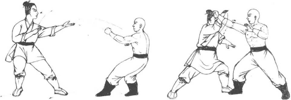 我右手向上架臂后要用一个划弧绕圆的动作不论敌出拳或腿都可用此缠抱随之是断骨之肘法后面的凤眼捶连环点穴要目标准确且要快速突然。此法可打敌前胸的任何一个大穴在具体应用中应灵活不必拘泥一穴。