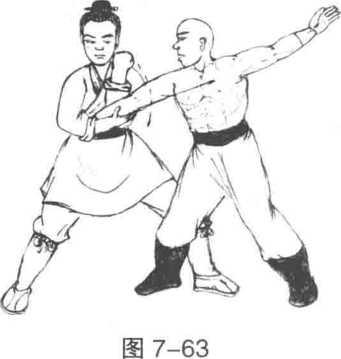3 一旦接触敌臂立即挽臂缠绕将敌臂夹住与此同时右旋体左臂内旋裹撞敌右肘外侧使其臂扭关节疼痛。(图7-63)