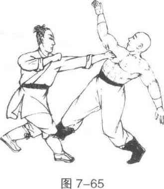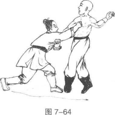 4 然后我左臂顺势猛地向下一压其臂右手凤眼捶弹射而出击打敌胸前之左乳中穴。(图7-64)