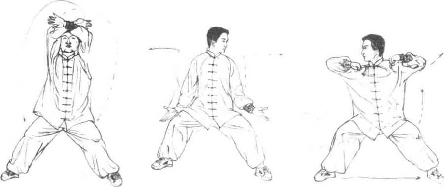 1 承接上势右脚落地身体微右转两腿膝关节弯曲成马步同时两臂向左右下落沉压的瞬间抬举交叉上架于头顶左臂在外目视正前方。(图6-88)