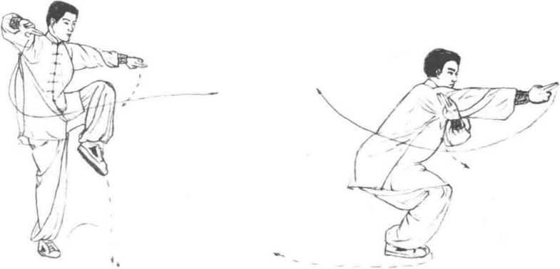 4 动作不停身体向左转90度右膝挺立伸直左腿屈膝提起同时两拳变掌向左右分开掌心向下目视前方。(图6-91)