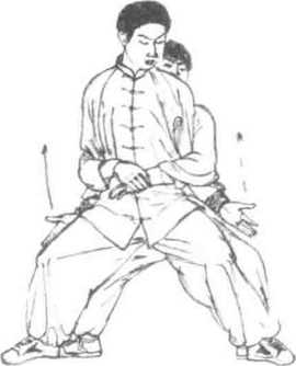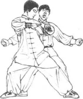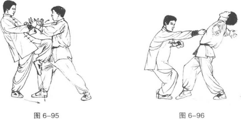 1 临阵对敌时如敌从我身后突然将我拦腰抱住我则身体迅速下沉蓄劲大吼一声两臂屈肘向上张抬将其双缠臂崩开并立即用左肘捣击敌心窝。紧随着左转身左手捞其右腕臂右手捞其左腕臂左膝提起顶击其前胸(图6-93?图6-95)