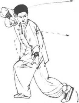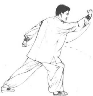 4 接着上体左转右手随左转时向左搂手随即右脚前移步屈膝半蹲,后腿蹬直成右弓步同时右手用力向前向上撩出高与肩平左手后摆至胯旁,掌心朝后目视右拳。(图6-100)