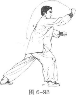 2 接着身体向右转180度右脚向右开步左腿蹬直成右弓步两掌随转体向前推抓而出掌心向前左下右上目视前方。(图6-98)