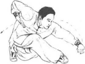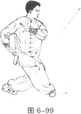 3 接着身体右转下盘成盖步随转体右手经头顶上方向右腰间盘手,左手经面前内盘手于右腋前目视右下方。(图6-99)