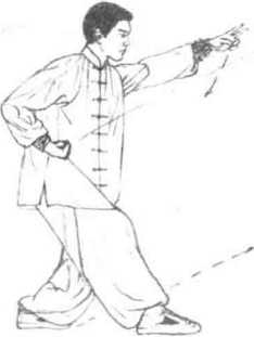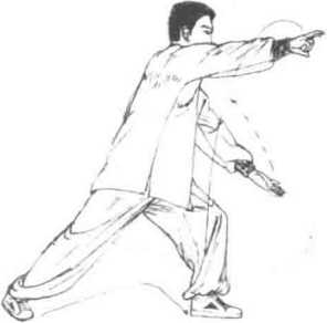 1 承接上势右脚向前一步身体后坐重心落于左腿屈膝下蹲成右虚步同时右手下压肘后收护于左腋下左手剑指向前点击肘臂略屈,目视左手指。(图6-159)