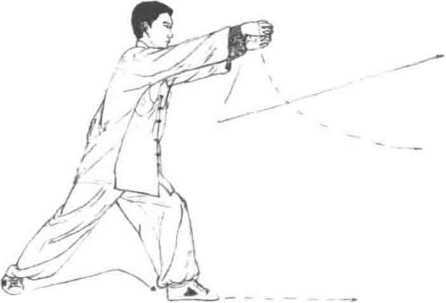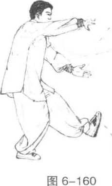 3 动作不停左脚向前落地屈膝前弯右腿挺膝蹬直成左弓步同时两手先回收腰间继随上体前拥之势两手再向前合拢抱抓肘臂略屈目视双手。(图6-161)