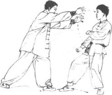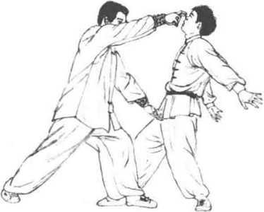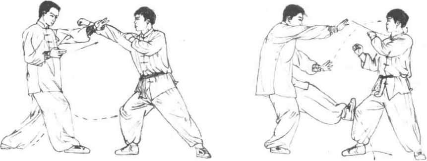 1 临阵对敌时对方前进右步、用右冲拳击打我方面部而来我方左脚速后撤一步同时上翻左手格阻其右腕内侧。随即右掌前按同时发出左脚,踩蹬其右膝关节。(图663、图664)