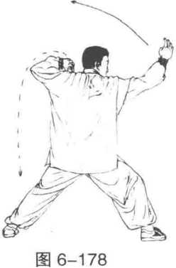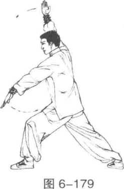 2 接着身体左转左脚尖外摆左膝屈蹲右膝挺直蹬力成左弓步,同时左掌随身体左转向下抡劈右掌向前划侧举于右上方掌尖向上目视左前方。(图6-179)