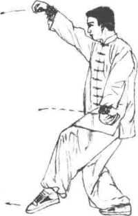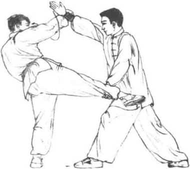 1临阵对敌时对方进步用右鞭腿朝我左腰侧踢击而来我方迅速撤退右脚一步左脚屈蹲前弓的同时左臂下插向外拦截其右腿随即勾腕挂住然后前滑步用右勾手啄击其面部。如对方上拦我左臂化开我右勾手我右手迅速绕其臂前穿变成二龙指插击其目致其重伤。(图6-184?图6-186)