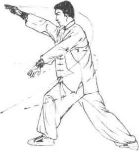 4 接着左脚向前一步屈膝前弓右腿挺膝蹬直成左弓步同时左勾手变掌向前下压右勾手成二龙指向前插出目视右手。(图6-181)