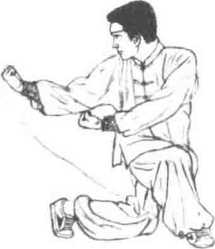 5 接着上体右转360度两膝下蹲成骑龙步同时两手握拳随转身划弧向右后用拳凸磕击,右臂前伸拳心向上,高与胸齐,左拳高与小腹平,目视右拳。(图6-182)