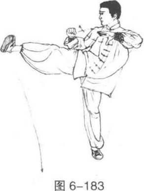 6 接着左腿伸直站立同时右腿朝右侧上方踹出同时右臂上抬前伸左拳护于右腋前目视右脚(图683)