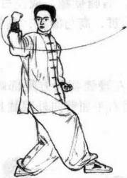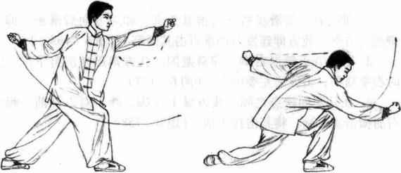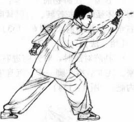 2 接着右脚向前步屈膝前弓左脚眼进一步挺膝伸直,成右弓步进身同时右手鸡心捶向前向左弧形损点勾击左手向后斜摆目视右拳。(图6-150)