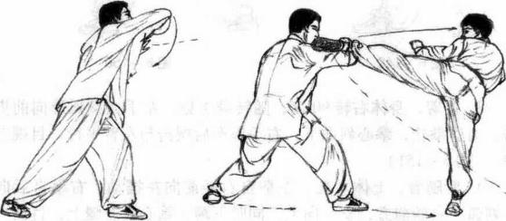 1 临阵对敌时对方前进右步、猛起左鞭腿朝我方腰部踢击而来我方后撤左脚一步沉身坐力同时右手屈臂向外阻截其左脚内侧。(图6-154)