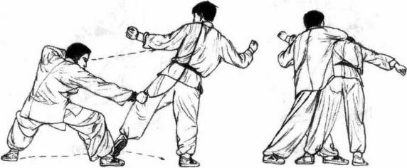 3 若对方再撤退右脚、仰身避闪我方则迅速沉身下坐同时右拳横扫击彼之左委中穴。(图6-157)