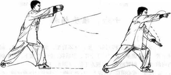 2接着重心前移到右脚上右腿屈膝左腿从后向前排踢高不过膝同时左掌下压右掌向左前方下按掌心斜向下两掌大拇