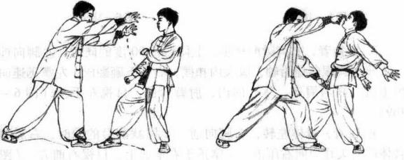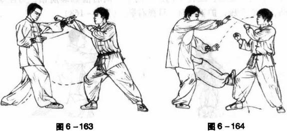 1 临阵对敌时对方前进右步、用右冲拳击打我方面部而来,我方左脚速后撤一步同时上翻左手格阻其右腕内侧。随即右掌前按同时发出左脚踩蹬其右膝关节。(图6-163、164)