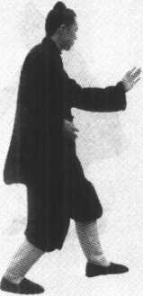 上动稍停,右掌略坐吐、前右脚承受重心后,腰身以右脚为 轴右转,左脚与左手同上,左脚经右脚侧呈外弧形斜前迈开尺 许,同时左手随腰身转动上步之时,由下至上划圆弧翻腕推掌