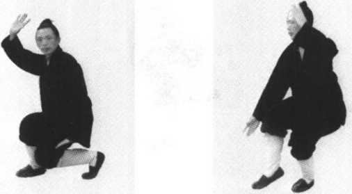 2 .虚步下切,身体徐徐慢起,重心在左,两手分别继续内 外旋,上下互照,如图第七式中动作一虚步下切势(图102)。