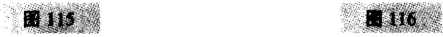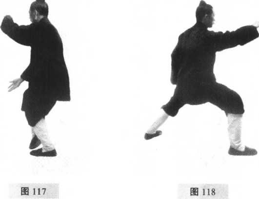 2.左分鬃。右脚尖外撇30?45。后承受重心,腰微右转, 右胯收住,左腿提起,虚点地于右脚侧,右掌内旋、下沉,平 肩,左掌随转体由下至上与右掌在胸前交叉后,置身前下部与 右掌呈抱球状(图117),随后,左脚渐缓向前偏左迈出,具体 幅度随腰身而定,腰身向左转,脚尖与膝盖尖方向一致,与右 脚尖基本平行,形成左弓腿,同时,左掌随转体向前由下至 上,翻臂转腕划弧形捌出(图118)。