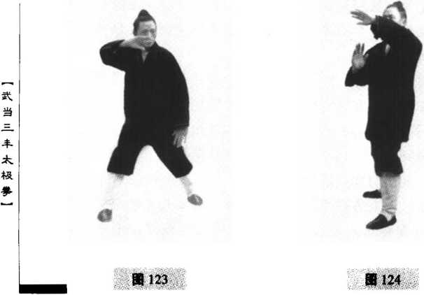 1 .西南角,身体重心在左,左脚往内扣45?60。,腰身随之 右转90°;同时右勾手,随转拳变掌,向下划弧经腹前至前右侧, 左掌随身右转时,下收划弧至左侧胯边;重心已渐移至右腿(图 123),随之身体继续右转,左脚上步,左脚经右脚前向西南方向 划弧,与地面划270。后落下;左手由下向上划弧搠出,随左脚落 定承担重心后,右手同时下沉,从右臂下按推(图124) o