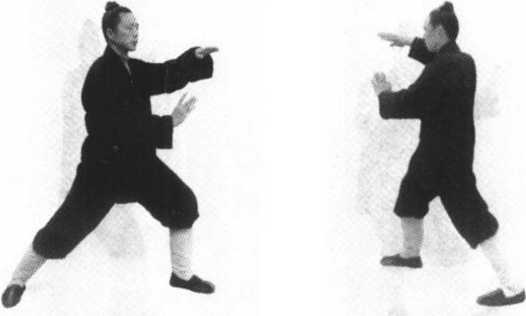 3 .东北角,接上式。身体后坐,腰身微向左转,虚起右 脚,右臂下沉,微屈肘,右手翻掌,左手转腕,拂于右肘下 侧;随后提起右脚,右手与腰身一起向侧前(东北方向)迈出尺 半许,随后落定承重,并以右脚跟为轴,身体右转,左脚随右 转上步,在右脚前尺许落定;同时,左掌由下至上划弧掘出,