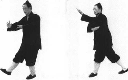 用法:这是搂膝拗步后的另两种变形拳势,前一种即为突 然向前,交叉搂腿手和进脚蹬腿,另一种就是侧身进步用揽雀