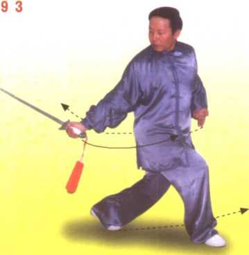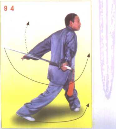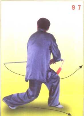 3. 右脚向前上步,脚尖外撇。 同时右手持剑向上、向右后绕摆; 左剑指附于右腕部。目视剑尖(图 96)o