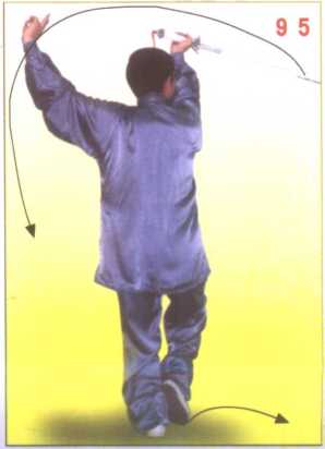 同时右手持剑 由后向下、向前、向上 撩起,举至头前上方; 左剑指向左、向上划弧 举至头左上方。目视剑 尖(图 93、94、95)。
