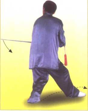 2. 行步要平稳。撩剑时要以腰 带臂,:以臂领剑,身、剑.手、脚 要配合协调,剑贴身绕转成立圆。