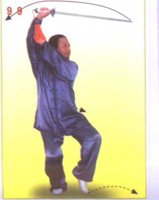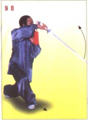 4. 9 69 6左、右脚沿弧线向前行步。 走第三步时左脚收至右脚内侧,脚 尖点地。同时右手持剑由后向下、 向前、向上撩至头前上方;左剑指 仍附于右腕部。目随剑走(图97、 98、 99)O