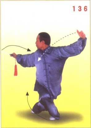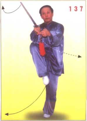 1 .左腿独立支撑;右腿屈膝提 起,脚面绷平并内扣。同时两臂外 旋,右手持剑回收,双手抱于胸前, 手心皆向上。目视剑尖(图137)。