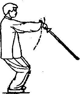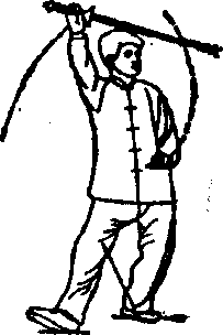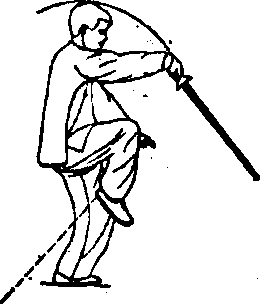 (1)提膝提手 重心移于左腿,右 腿提起;同时右手提剑,左手下落;眼 向前看。(图1。)