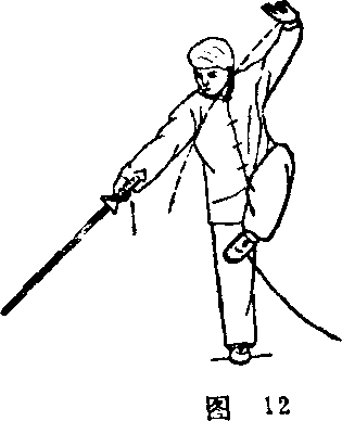 (3)提膝点剑重心前移,身 体继续右转,右腿独立,左腿提 膝;同时右手剑向右前下方点出, 左剑指向后版形摆至头左侧上方, 手心斜向上;眼看剑尖° (图12)