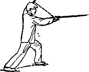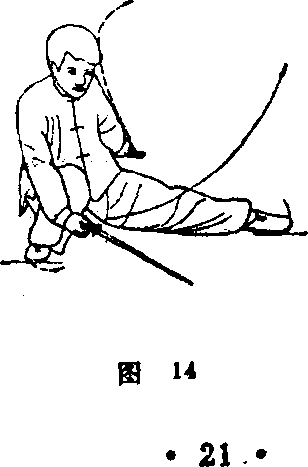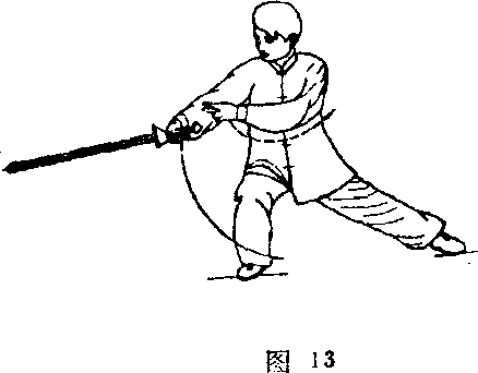 (1)落步落剑右 腿屈膝,左腿向左后撤步 成左弓步;同时右手剑下 落,高与胯平,左剑指附 于右小臂;眼看剑尖. (图 13)