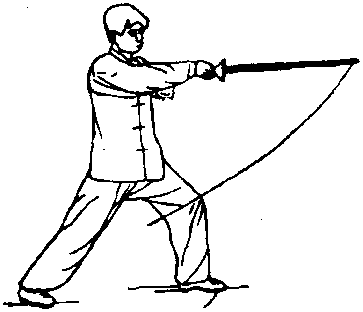 (2)弓步扫剑右手剑 向后经头上,翻手心向上向前 平扫,高与腰平,左剑指附于右 手腕;同时,重心前移成右弓 步;眼看剑尖,(尾76)
