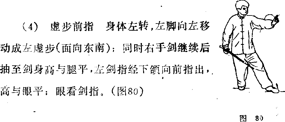 (3)转身抽剑重心后坐,身体 右转,左脚尖里扣;同时右手剑弧形 后抽至右胯侧,剑尖略低,左剑指附于 右手腕;眼看右后方.(图79)