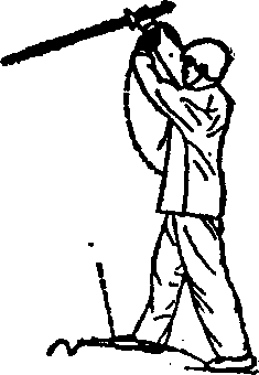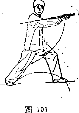 (1)垫步挂劈重心移 于左脚,右脚提起,左脚微向后 跳步,右脚向右后落地成左弓 步;同时右手剑向后向前挂劈 (腕花),左剑指下落附于右手 一腕;眼看剑尖。(图97)