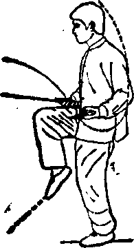 (3)垫步分手 重心前移,左脚向前上(3)垫步分手 重心前移,左脚向前上步,右腿提膝,左脚蹬地微跳(垫步);同时步,右腿提膝,左脚蹬地微跳(垫步);同时(2)转身拉剑 重心后移,身体右转, 左脚里扣,随即重心移于左腿,身体继续右 转,右脚向右移动成高虚步;同时右手剑随 转身向下向后提举至头右前方,左剑指仍附 于右手腕;眼看剑尖。(图98)