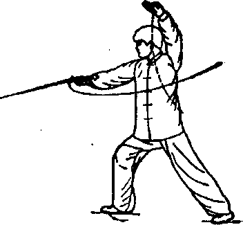 (4)弓步剌剑右脚向前落 地,重心前移成右弓步;同时右手 , 剑向前下刺,左剑指弧形摆至头左