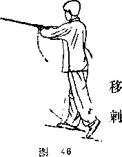 图图(1)蹬腿悻剑左祀独立右腿提膝脚尖勾起向前蹬品同时两手收捧于胸浙随之稍前剌眼看剑尖(图45)图5图5(2)落步剌剑右脚向前落步重心前左脚跟提起同时右手剑继续向前平左手仍捧于右手背眼看剑尖。(图处)图5图5(3)跳步分手右脚蹬地左脚跳起落弛左腿提膝同时两手向左右分开弧形撤至体恻,手心均同下左手掌变剑指眼向前看(图47)4)弓步平剌 梧右脚向前落步跟着地重心前移成右弓步同时右手剑翻手心向上向里转裹向前平剌左剑指向后间上弧形摆至头侧上方手心斜向上眼看剑尖口(图48) 爻图48要点 蹬腿时力在脚跟腿要蹬平蹬腿和捧剑要同时完成