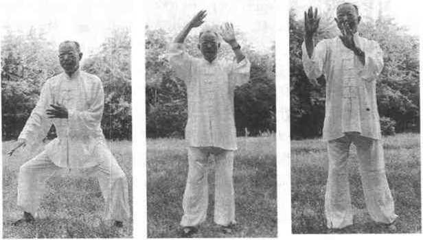 由白鹅亮翅双掌心向下落到胸前时, 两手相距一尺、手心相对(图5-1),同时 双手向右旋转上抬,左手在中线,手高与 鼻尖齐(图5-2),双手微向下旋转,双 脚成骑马式,左手旋转向左边,左脚腿向 左摆一步,脚尖向东北,手与脚一致斜向 东北,平掌伸出与肩高,右手在旋转时变 为勾手、大拇指在中指中节,手在右肩前 方伸出,右脚直前