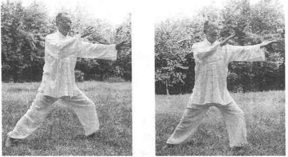 要领 由单鞭过度(图6-1)时,重心在右脚,在双手臂往 返旋转时,身形不变,仅以双裆胯虚实变化,双脚随势摆动,左