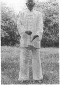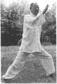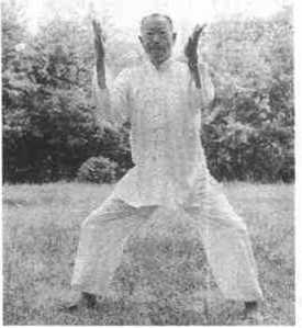 十字手交叉时,左脚向左侧方向滑蹬时,松裆胯变骑马步时, 身往下蹲靠自打上。马步时,左右手心在膝盖处向外翻,是以手 采捌对方手用,同时也是搬对方脚腿,左右手都转大圆圈,不论 采、搬脚,对方必跌。