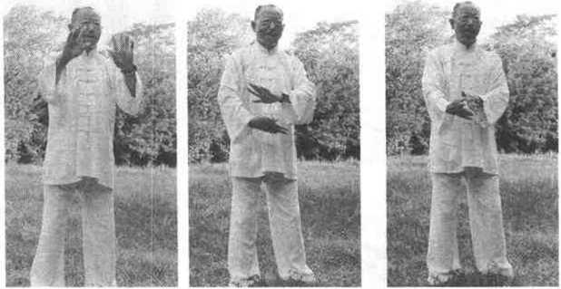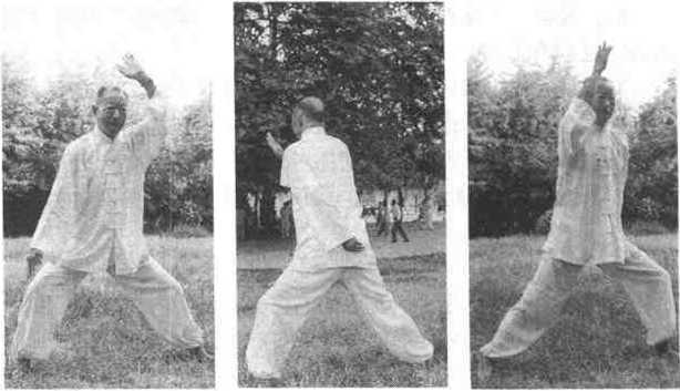走姿势时,必须身、手、脚一齐行动,不抽扯而完整一劲,返回 时同。双手肘臂旋转。右手护心护面,左手经头顶百会穴而向前 转向右。往返身子一致,两臂圆圈转圆.