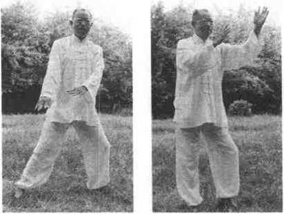 图7-2 图7-3图7-2 图7-3脚向左横排一步不 落地(图7-2),随 时向右返还,双手 向上,右手经面 部,左手经头顶百 会穴,同时向右随 身走时双手推出, 返还原地,双足与 肩宽,左手在面 前,右手在右肩前 上方,面向东北 (图 7-3).
