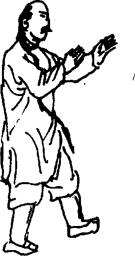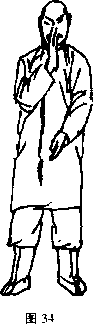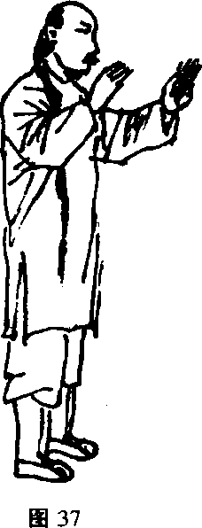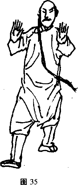 接上式。向上长身,右拳变掌,向右上方硼起,双臂向下搬;左 脚向西北方退一大步,右脚空步随左脚下退,转动不落地,遂再向 原步前上一大步。两臂向东南方经苏劲再按出。左脚跟上,与右脚 成不丁不八步。左手食指与鼻相照;?右手偏右。两手指梢与肩平。周身松弛,面向东北(图34?37)。注:两手划圆时,左右循环要经中心线。意即引进落空,沾连粘随,不丢不 顶,劲发丹田,随对方来势顺势按击。