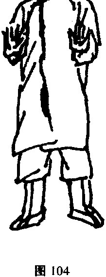 接上式。左手拇指点左大腿根气冲穴;右臂向内旋转,带动手 掌由体中线下划至裆;再向外转化,由右膝下以肘为中心肘绕大圆 圈,经百会穴向右前方按出。右脚尖跟随右手绕囱的方向在原地 转动。同时左手由体中心线向上绕小圆圈,向右手一起按出。食指 与鼻相照;右手偏右,距左手尺许。此时左脚跟上一步,成不丁不八 步形。两手落位后,指梢与肩略平(图101 ~ 104)。